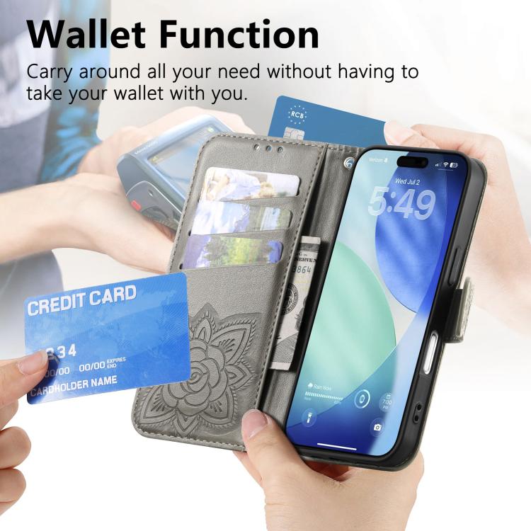 Funda de cuero con relieve de mariposa y flor para iPhone 17 Pro Max (gris)
