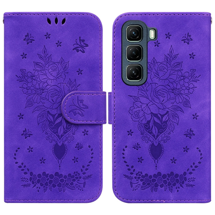 Funda de Cuero con Relieve Mariposa y Rosa para Infinix Hot 50 5G (Morado)