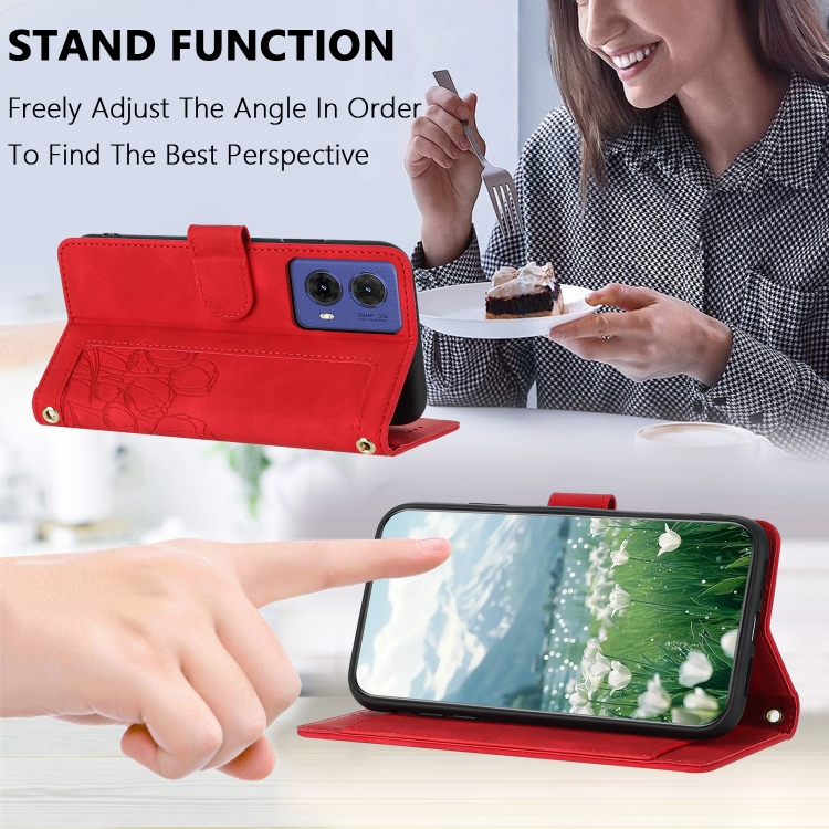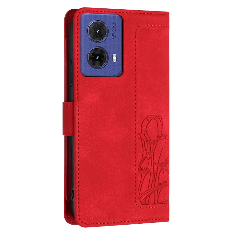 Funda de Cuero con Relieve de Tulipanes para Motorola Moto G85 con Cordón (Rojo)