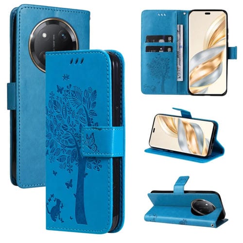 Funda de Cuero con Tapa y Estampado Árbol y Gato para Honor X9C 5G (Azul)