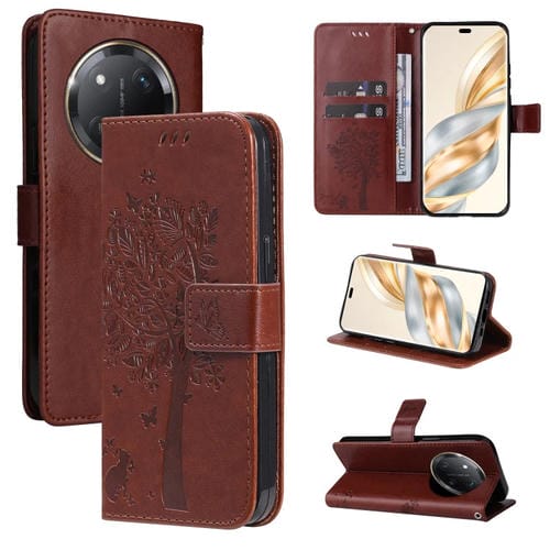 Funda de Cuero con Tapa para Honor X9C 5G Global con Estampado de Árbol y Gato (Café)