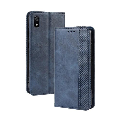 Funda de Cuero con Tapa Horizontal con Textura de Caballo Loco Retro con Hebilla Magnética para Xiaomi Redmi 7A, con Soporte, Ranuras para Tarjetas y Marco de Fotos (Azul)