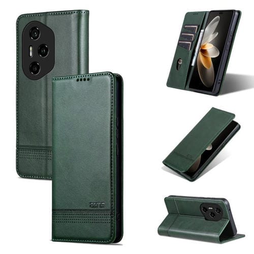 Funda de Cuero Azns con Tapa Magnética Textura Piel de Becerro para Honor 300 Pro (Verde Oscuro)
