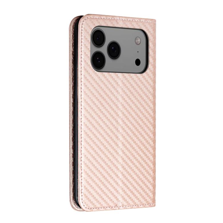 Funda de cuero con tapa magnética y textura de fibra de carbono para iPhone 17 Pro Max (oro rosa)
