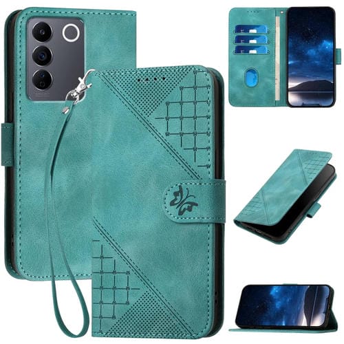 Funda de Cuero con Tapa y Cordón para Vivo V27 Pro 5G Global Yx0080 con Diseño En Relieve de Mariposa y Cuadrícula (Azul Claro)