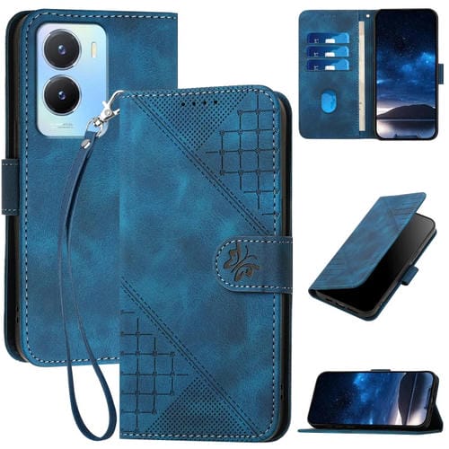 Funda de Cuero con Tapa y Cordón para Vivo Y56 5G Global Yx0080 con Diseño En Relieve de Mariposa y Cuadrícula (Azul Oscuro)