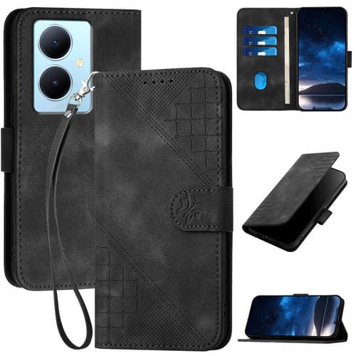 Funda de Cuero con Tapa y Cordón para Vivo Y78 5G Global Yx0080 con Diseño En Relieve de Mariposa y Cuadrícula (Negro)
