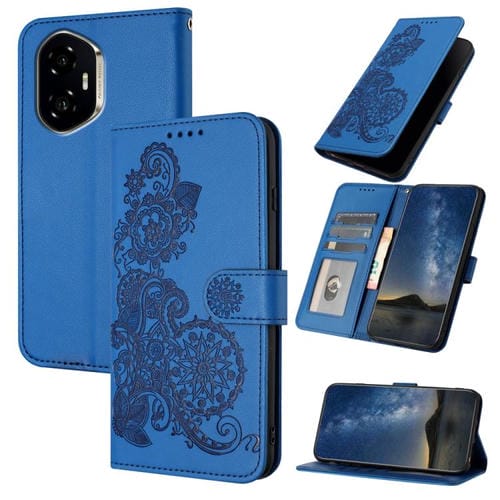 Funda de Cuero con Tapa y Flor de Datura en Relieve para Honor 300 (Azul)
