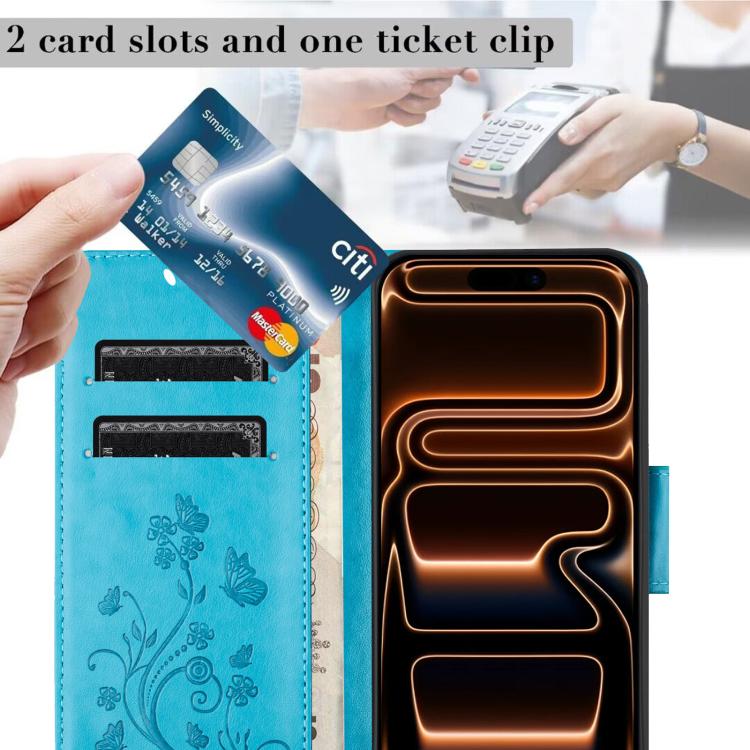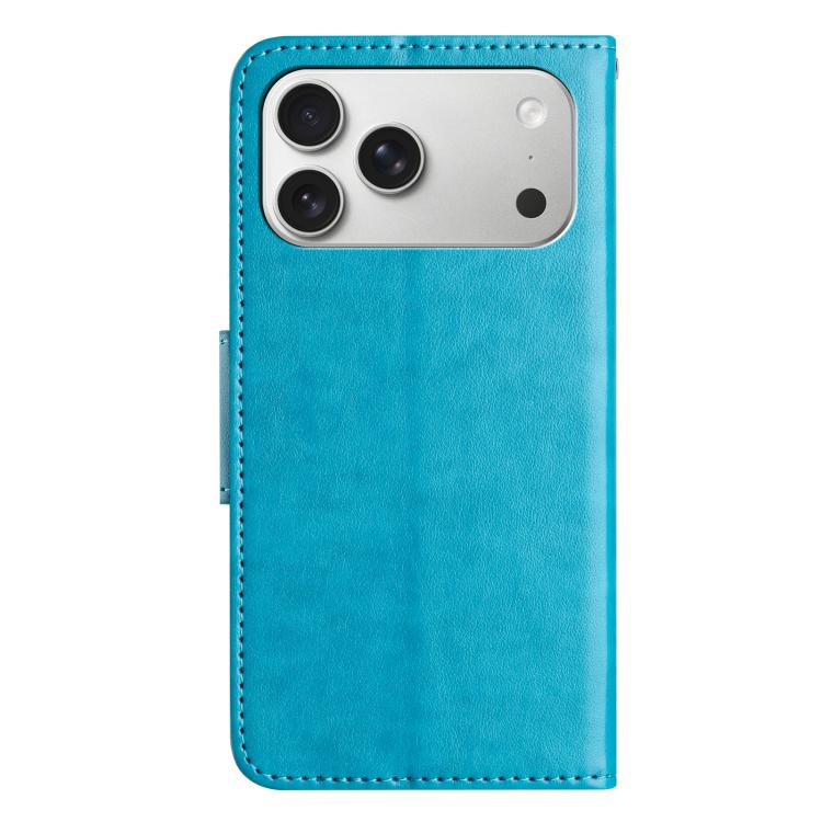 Funda de cuero con tapa y diseño de mariposas y flores para iPhone 17 Pro Max (azul)