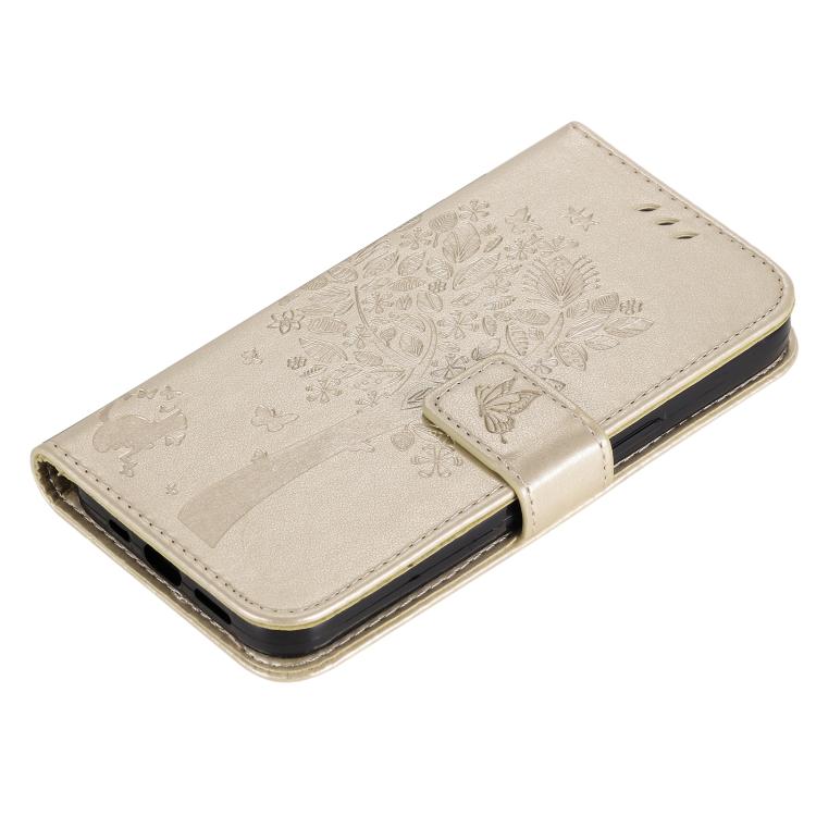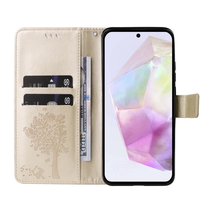 Funda de cuero con tapa y estampado de árbol y gato para Samsung Galaxy A36 5G / M56 5G (dorada)