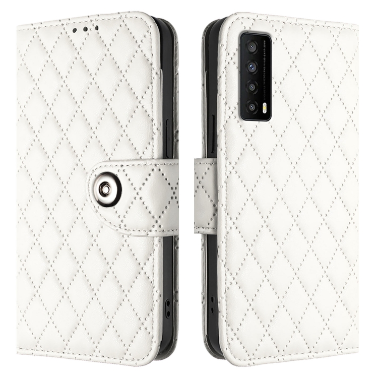 Funda de Cuero con Tapa y Textura Rombal para TCL Stylus 5G con Cordón (Blanco)