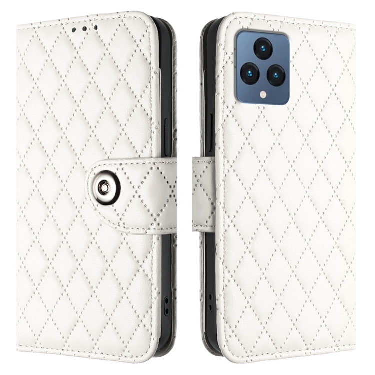 Funda de Cuero con Tapa y Textura Rómbica para T-Mobile Revvl 6/6X 5G con Cordón (Blanco)
