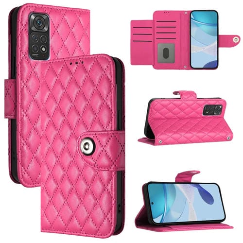 Funda de Cuero con Tapa y Textura Rómbica para Xiaomi Poco M4 Pro 5G con Cordón (Rosa y Rojo)