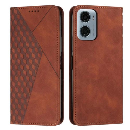 Funda de Cuero Magnética para Motorola Moto G05 con Diseño de Empalme de Diamantes (Marrón)