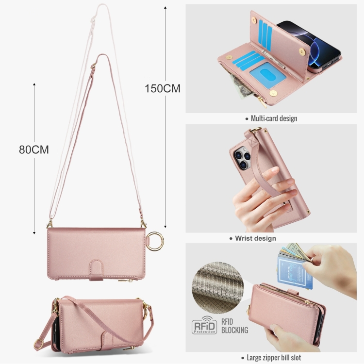Funda de Cuero para Teléfono con Billetera Multifuncional con Anillo Cruzado para iPhone 16 Pro Max (Oro Rosa)