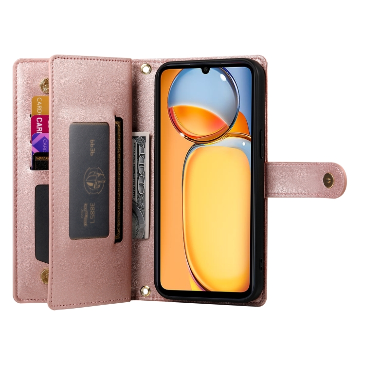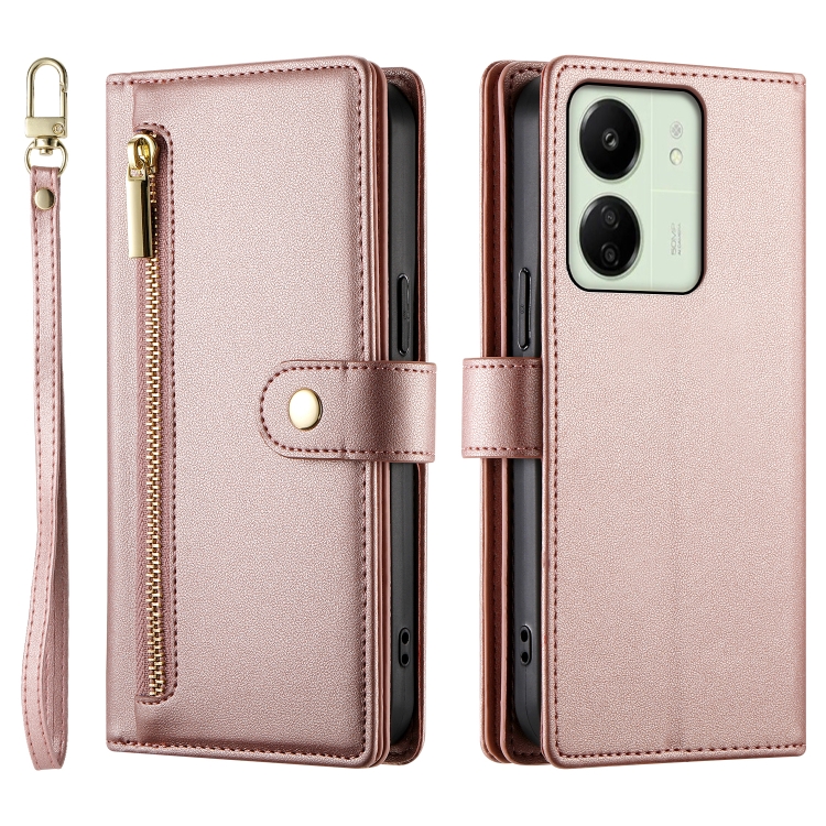 Funda de Cuero para Teléfono con Nueve Ranuras para Tarjetas y Cremallera para Redmi 13R/Xiaomi Poco M6 (Rosa)