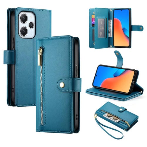 Funda de Cuero para Teléfono Redmi 12 5G/4G/Note 12R con Nueve Ranuras para Tarjetas y Cremallera (Azul)