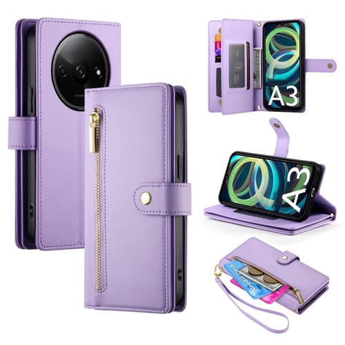 Funda de Cuero para Teléfono Redmi A3 con Nueve Ranuras para Tarjetas y Cremallera (Morado)