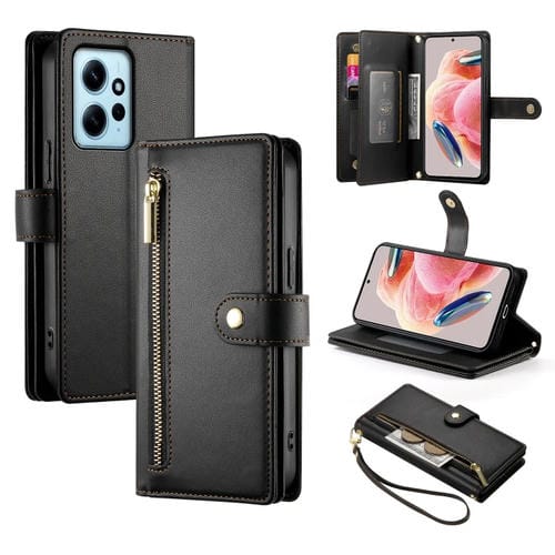 Funda de Cuero para Teléfono Redmi Note 12 4G / Note 12R Pro con Nueve Ranuras para Tarjetas y Cremallera (Negro)