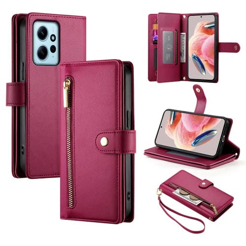Funda de Cuero para Teléfono Redmi Note 12 4G / Note 12R Pro con Nueve Ranuras para Tarjetas y Cremallera (Rojo)