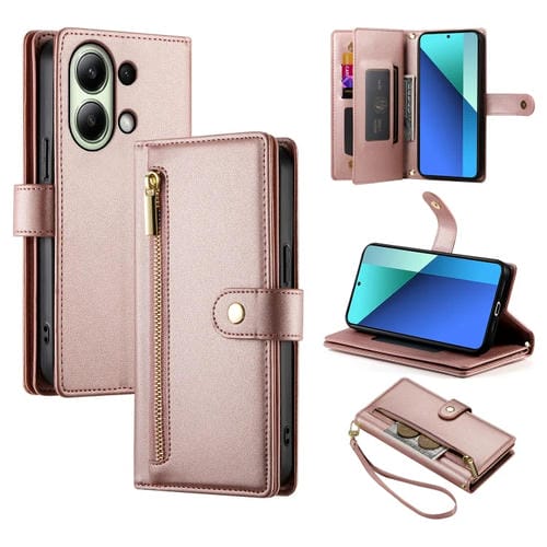 Funda de Cuero para Teléfono Redmi Note 13 4G con Nueve Ranuras para Tarjetas y Cremallera (Rosa)