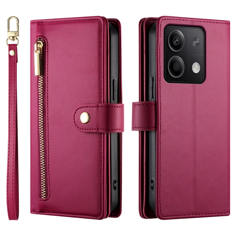 Funda de Cuero para Teléfono Redmi Note 13 5G con Nueve Ranuras para Tarjetas y Cremallera (Rojo)
