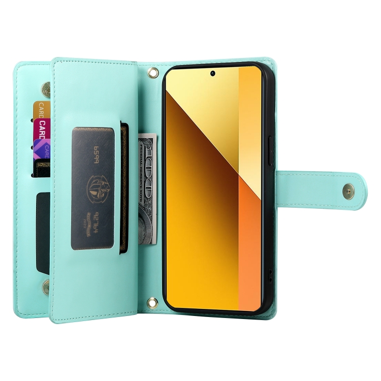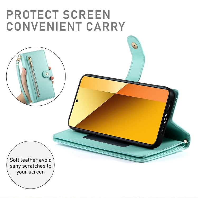 Funda de Cuero para Teléfono Redmi Note 13 5G con Nueve Ranuras para Tarjetas y Cremallera (Verde Menta)