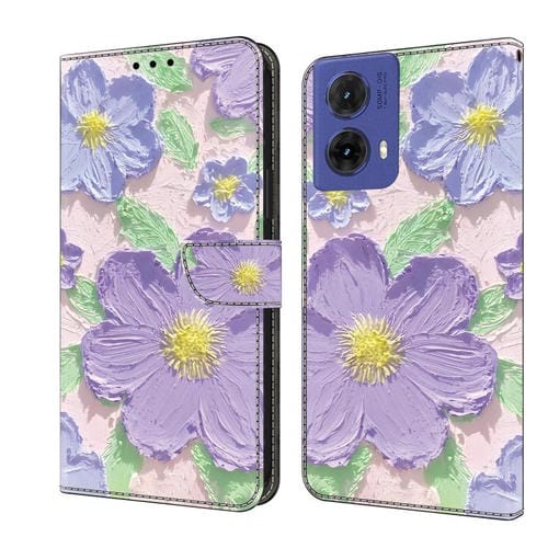 Funda de Cuero Pintada a Mano para Motorola Moto G85 con Flores Moradas (Óleo)