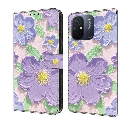 Funda de Cuero Pintada a Mano para Redmi 12C/11A (Pintura al Óleo con Flores Moradas)
