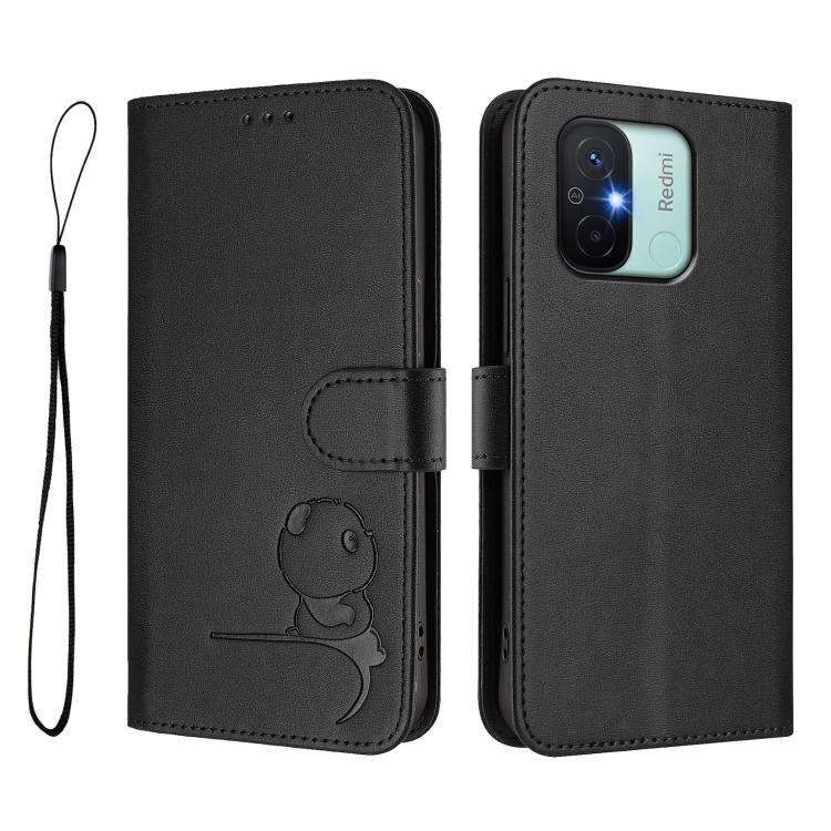 Funda de cuero RFID con estampado de panda y cordón para Redmi 11A / Xiaomi Poco C55 (negro)