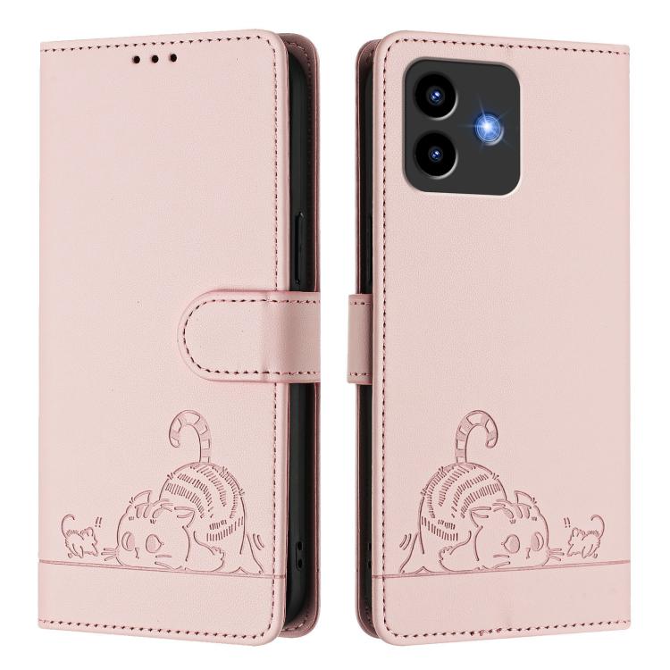Funda de Cuero Rfid para Cubot Note 40 con Estampado de Rata y Gato en Relieve y Cordón (Rosa)