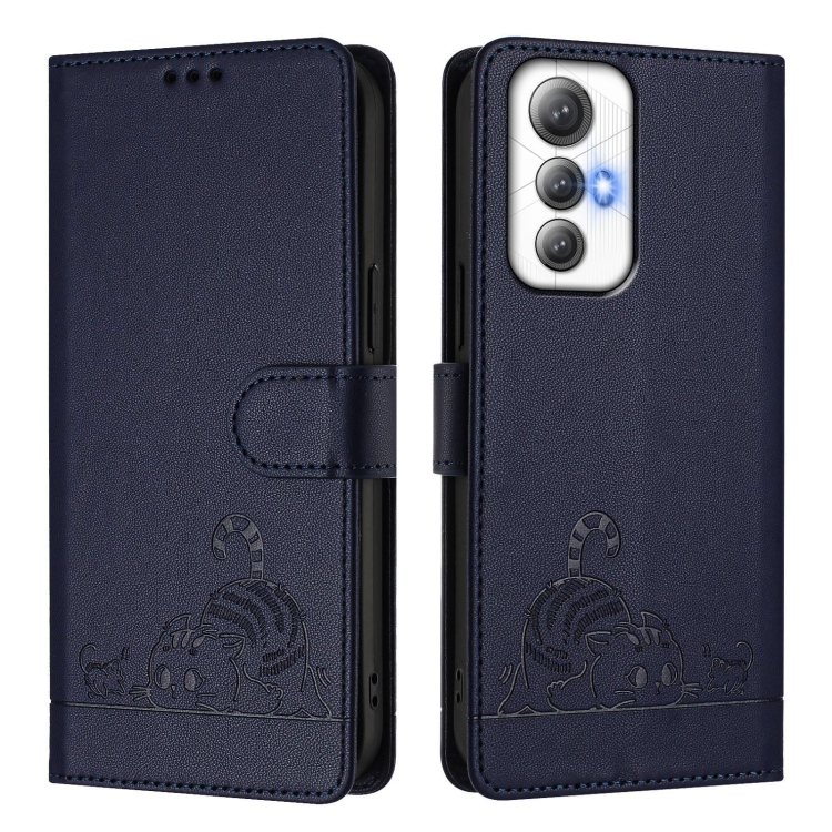 Funda de Cuero Rfid para Cubot Max 5 con Cordón Estampado en Relieve Gato y Rata (Azul)