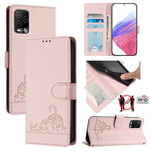 Funda de Cuero RFID con Relieve de Rata y Gato para Blu View 5 Pro con Cordón (Rosa)