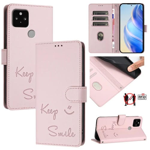 Funda de Cuero Rfid con Relieve Sonriente para Google Pixel 5 (Rosa)