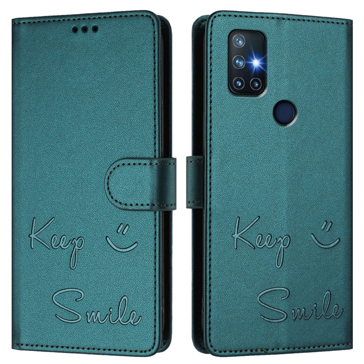 Funda de Cuero Rfid con Relieve Sonriente para OnePlus Nord N10 5G (Verde Pavo Real)