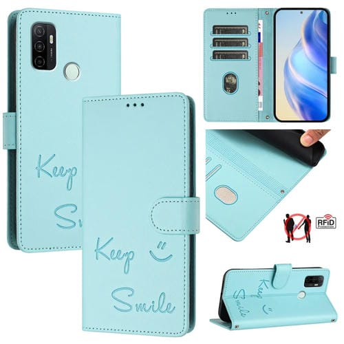 Funda de Cuero Rfid con Relieve Sonriente para Oppo A11S 4G (Verde Menta)