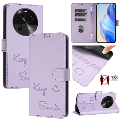 Funda de Cuero Rfid con Relieve Sonriente para Oppo Find X6 (Morado Claro)