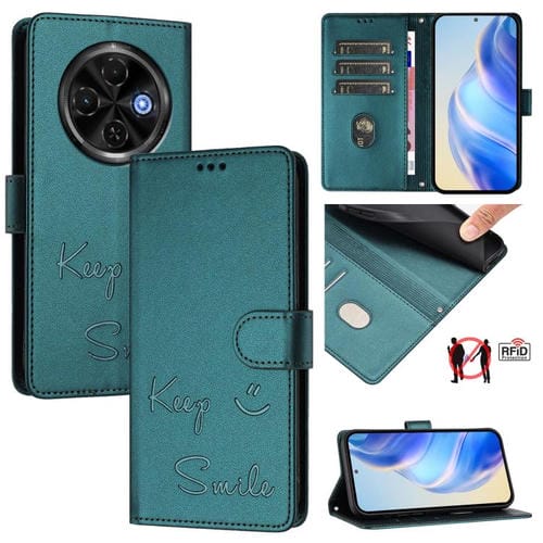 Funda de Cuero Rfid con Relieve Sonriente para Tecno Spark 30C 5G Pop 9 5G (Verde Pavo Real)