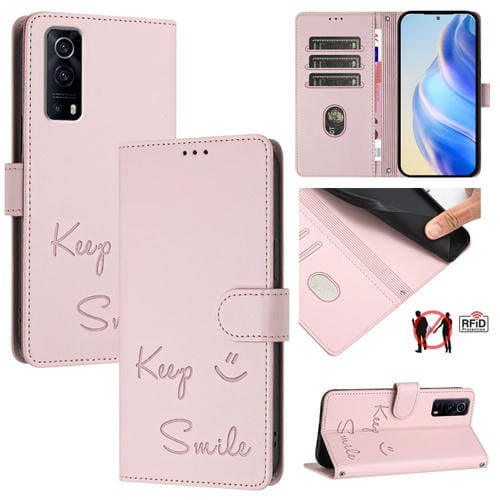 Funda de Cuero Rfid con Relieve Sonriente para Vivo Y72 5G / Iqoo Z3 / Y52 5G (Rosa)