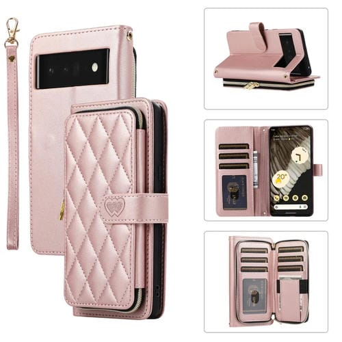 Funda de Cuero tipo Billetera con Cremallera Completa y Diseño Rombal para Google Pixel 6 Pro (Oro Rosa)