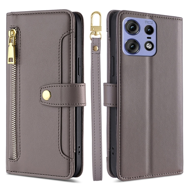 Funda de Cuero Tipo Billetera con Cremallera y Textura de Oveja para Motorola Edge 50 Pro 5G (Gris)