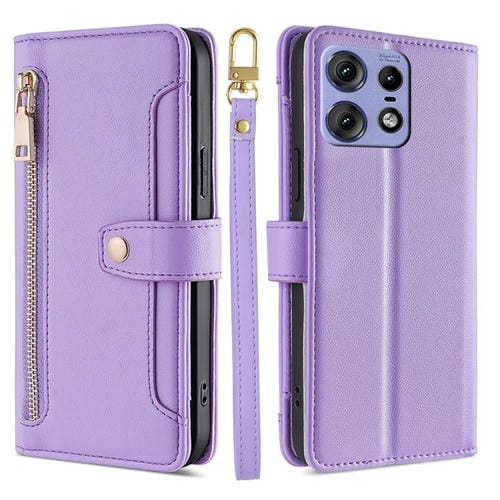 Funda de Cuero Tipo Billetera con Cremallera Textura de Oveja para Motorola Edge 50 Pro 5G (Morado)