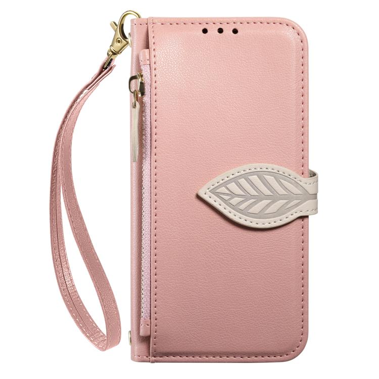 Funda de cuero tipo billetera con hebilla de hoja y cremallera para iPhone 17 Pro (rosa)