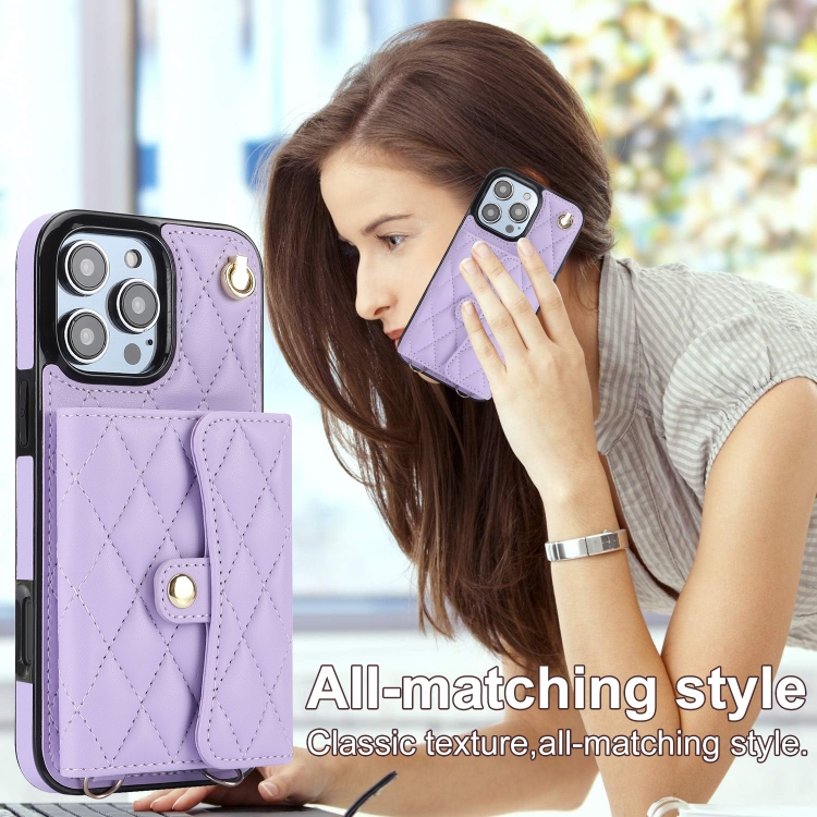 Funda de Cuero Tipo Billetera Horizontal con Diseño de Rombos y Bandolera para iPhone 16 Pro Max (Morado)