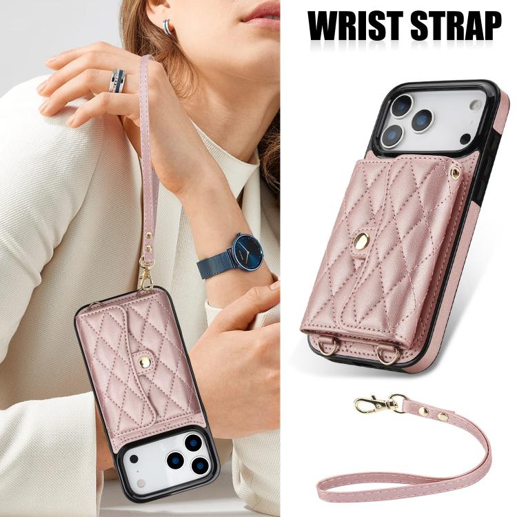 Funda de cuero tipo cartera horizontal con diseño rómbico y bandolera para iPhone 17 Pro (oro rosa)