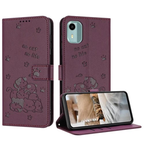 Funda de Piel para Nokia C12 con Diseño de Gatito en Relieve y Cordón (Rojo Vino)