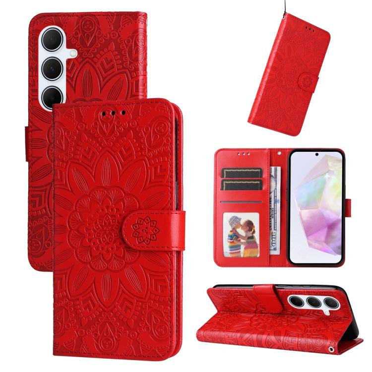 Funda de piel con estampado de girasoles en relieve para Samsung Galaxy A56 5G (roja)