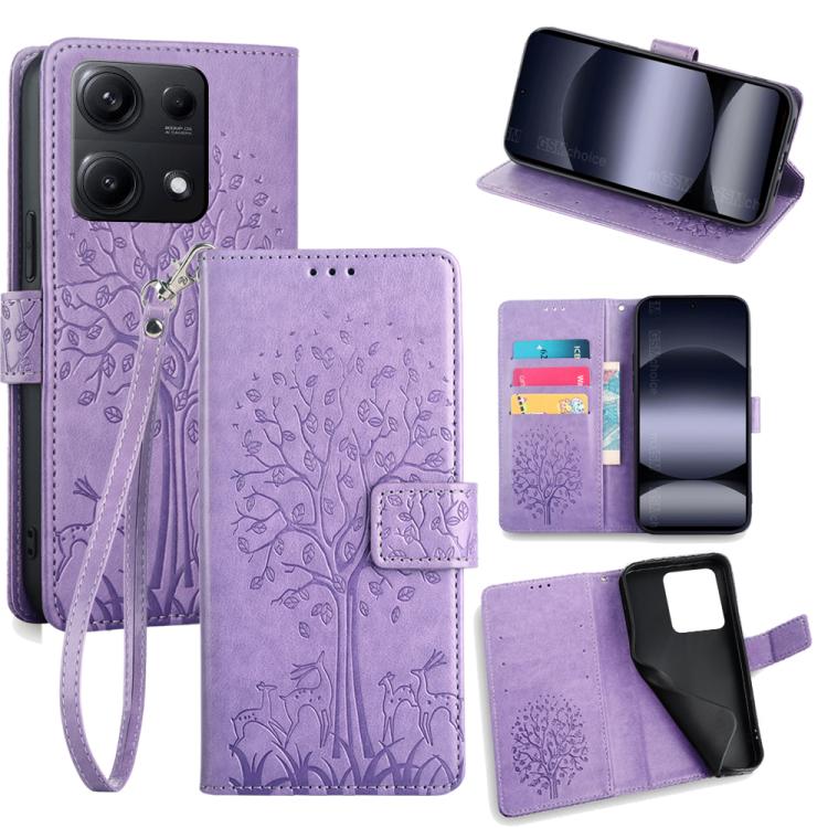 Funda de piel con relieve de árbol y ciervo para Redmi Note 14S 4G (morada)