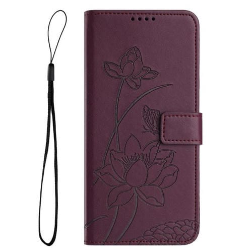 Funda de piel con relieve de loto para iPhone 17 con cordón (rojo vino)