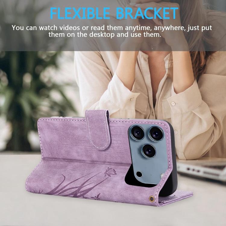 Funda de piel con relieve de mariposa y orquídea para iPhone 17 Pro (morada)